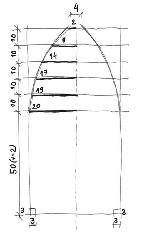 - Przygotuj wykrój jednego elementu – najlepiej zrobić to na papierze lub tekturze. Arkusz jakiego potrzebujesz musi mieć wymiar minimum 40cmx100 cm. W ramach tego wykroju, odmierz dwie osie – dłuższą oraz krótszą. Oś pionową o długości 100 cm podziel na dwie części – górną 50 cm i dolną. Górną część osi należy podzielić prostopadłymi liniami co 10 cm na pięć odcinków. Na każdej linii odmierzyć odpowiednią długość w milimetrach, według podanego wzoru.